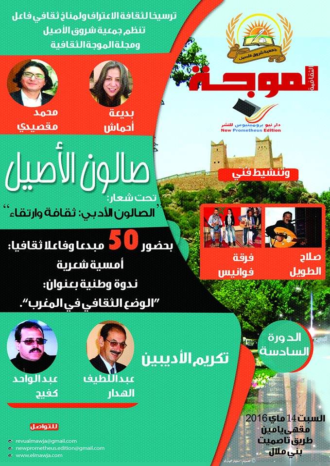 تنظم مجلة الموجة الثقافية، وجمعية شروق الأصيل صالون الأصيل الأدبي والثقافي، في دورته السادسة بمدينة بني ملال، تحت شعار:”الصالون الأدبي: ثقافة وارتقاء”، السبت 14 آيّار/ماي الجاري.