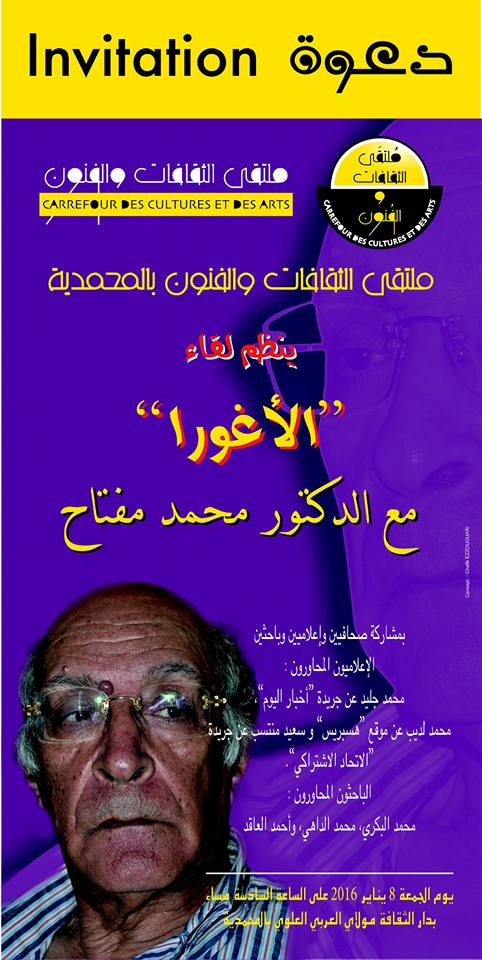 في أولى أنشطته الثقافية لسنة 2016، ينظم ملتقى الثقافات والفنون بالمحمدية، لقاء حواري مع الناقد والباحث الدكتور محمد مفتاح. وذلك اليوم الجمعة 8 يناير 2016.