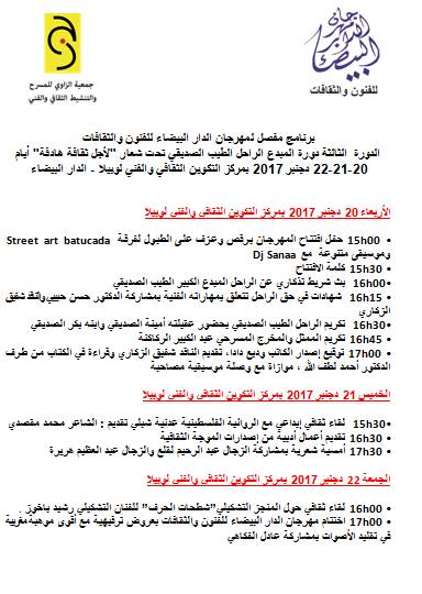 تنظم جمعية الزاوي للمسرح والتنشيط الثقافي والفني، بدعم من وزارة الثقافة والاتصال المغربية، وبشراكة مع مجلس عمالة الدار البيضاء والموجة الثقافية، وبتعاون مع جهة الدار البيضاء سطات ومقاطعة سيدي بليوط ، مهرجان الدار البيضاء للثقافات والفنون، في دورته الثالثة: دورة المبدع الراحل الطيب الصديقي، وذلك تحت شعار “لأجل ثقافة هادفة”، طيلة الأيام 20، 21، 22 دجنبر 2017، بمركز التكوين الثقافي والفني لوبيلا…