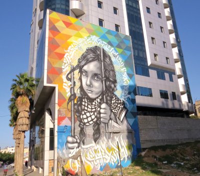 وسط غزّة، وعلى حائط أكبر أبراجها المرتفعة، أنجز مجموعة من الفنانين الفلسطينيين الشباب، أكبر جدارية في فلسطين، تحاكي واقع الطفولة فيها، بصورة ضخمة لطفلة بدت ملامحها حزينة مُحاصرة خلف قضبان حديدية تتوشّح الكوفيّة الفلسطينية.