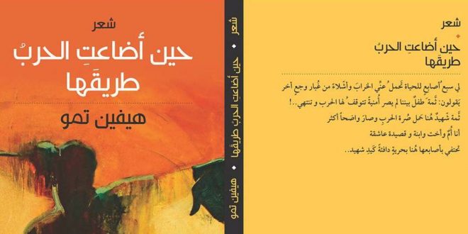 هيفين مشعل تمو، شاعرة سورية كُردية، تكتب الشعر منذ ما يقرب من خمسة عشر عاماً، إلا أنها تأخرت كثيراً في إصدار ديوانها الأول، والذي نحن بصدد الحديث عنه: “حين أضاعت الحرب طريقها”، وقد ذكرت في حوار سابق معها أن سبب تأخر خروج مجموعتها الأولى للنور هو تلك الانزياحات المتكررة التي مرت بها بالإضافة إلى أصابع القدر الخفية، بين الحين والاخر، وانعكاس كل ما يحتويه الخارج من وحشة وخراب على روحها.