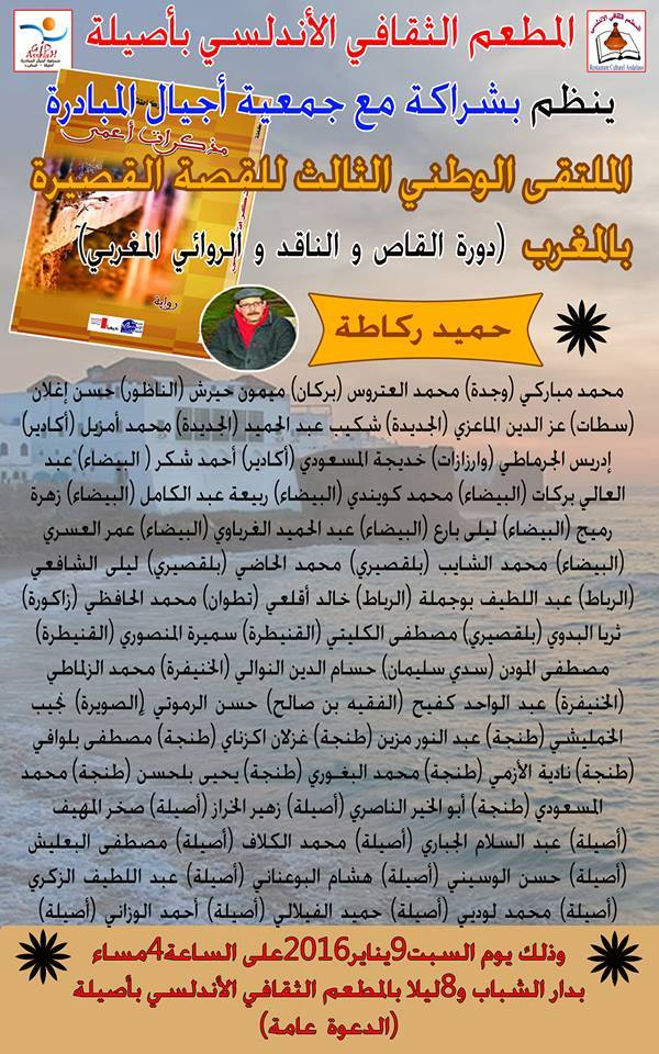 بشراكة بين جمعية أجيال المبادرة بأصيلة والمطعم الثقافي الأندلسي، سينظم الملتقى الوطني الثالث للقصة القصيرة بالمغرب (دورة القاص حميد ركاطة) بأصيلة يوم السبت 9 يناير 2016 ابتداء من الساعة العاشرة صباحا وفق البرنامج الآتي: