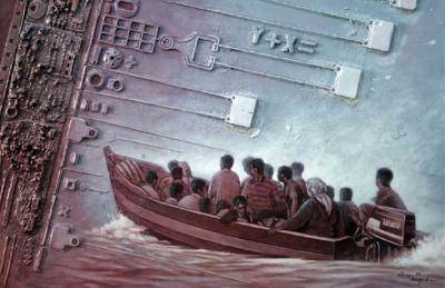 تحضر في أعمال بوزيد تلك القدرة على المزج ما بين التجريد والتشخيص الفني، إذ نلاحظ في الهيئات المرسومة عملية توزيع منتخبة فوق السند، وكأننا إزاء تشظٍ مقصود فوق إطار مكاني يشبه لحد بعيد عملية ترتيب قطع «البزل» لإتمام وجودها.. فقد توفق في خلط بين السطح التجريدي وكل تلك الصبغة التشخيصية بعناصرها الممتدة الواضحة، كما لو كانا صوتين متحاورين ومتفاعلين، يتمازجان بصخب، أو حتى بكل الطاقة الممكنة للصمت المطبق.