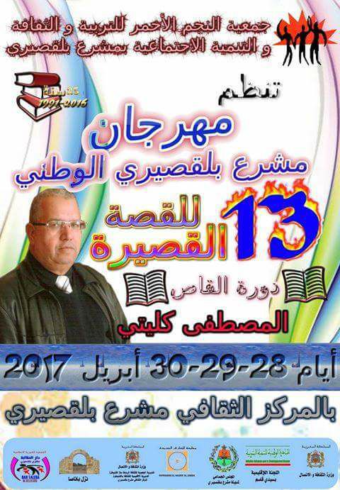 تنظم جمعية “النجم الأحمر للتربية والثقافة والتنمية الاجتماعية” بمشرع بلقصيري بدعم من وزارة الثقافة والاتصال والمبادرة الوطنية للتنمية البشرية، “مهرجان مشرع بلقصيري الوطني الثالث عشر للقصة القصيرة” (دورة القاص المصطفى كليتي)، أيام: 28، 29، 30 أبريل 2017، بالمركز الثقافي ـ مشرع بلقصيري. حسب البرنامج التالي: